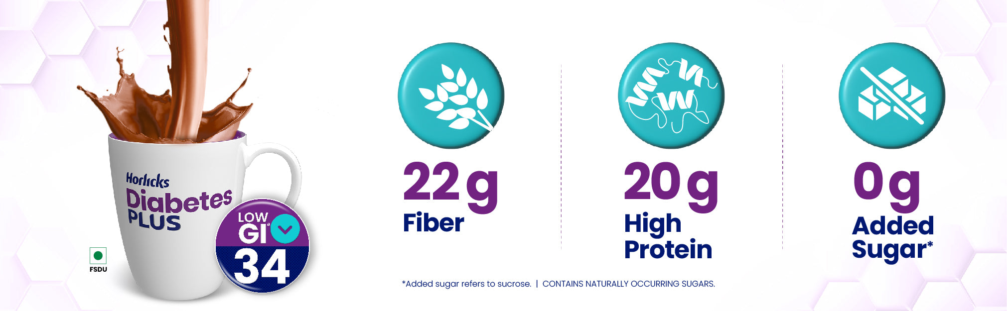 Horlicks Diabetes Plus is dual blend high fibre nutrition drink for Diabetes. Research has shown that diet rich in fibre helps reduce glucose and lipids in blood*.